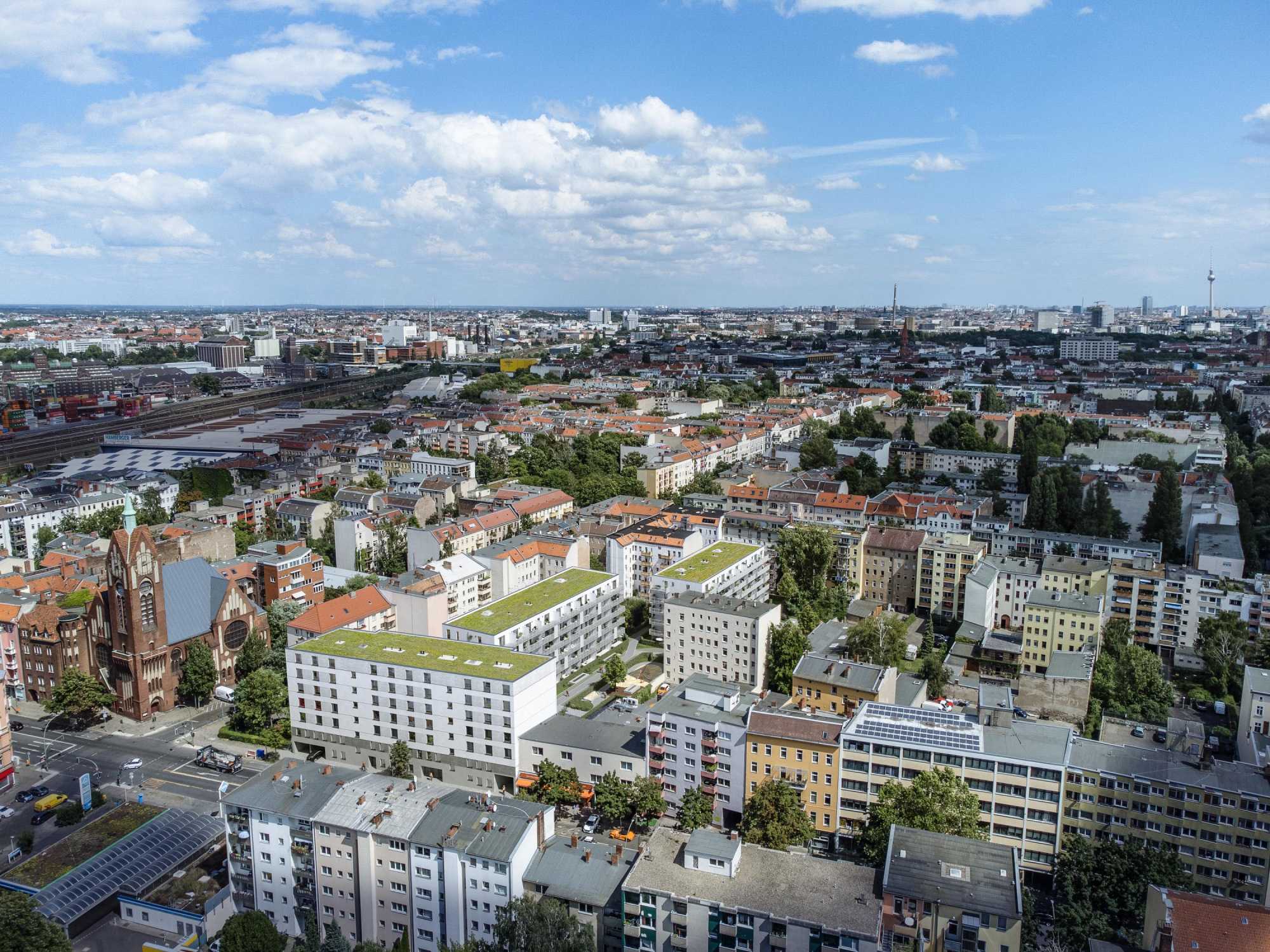 Luftaufnahme einer Stadt mit Wohnhäusern, Kirche, Bahngleisen und blauem Himmel.