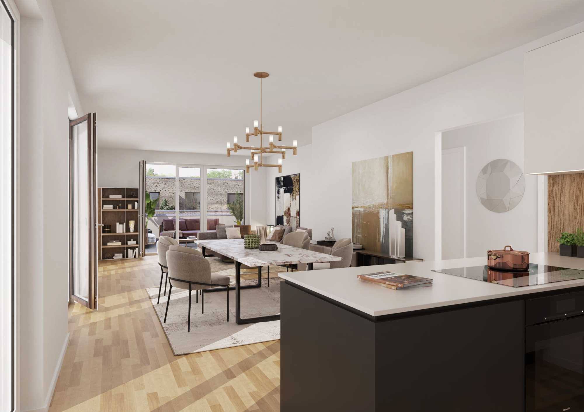 Moderne offene Küche mit Essbereich und Wohnzimmer, helle Einrichtung.
