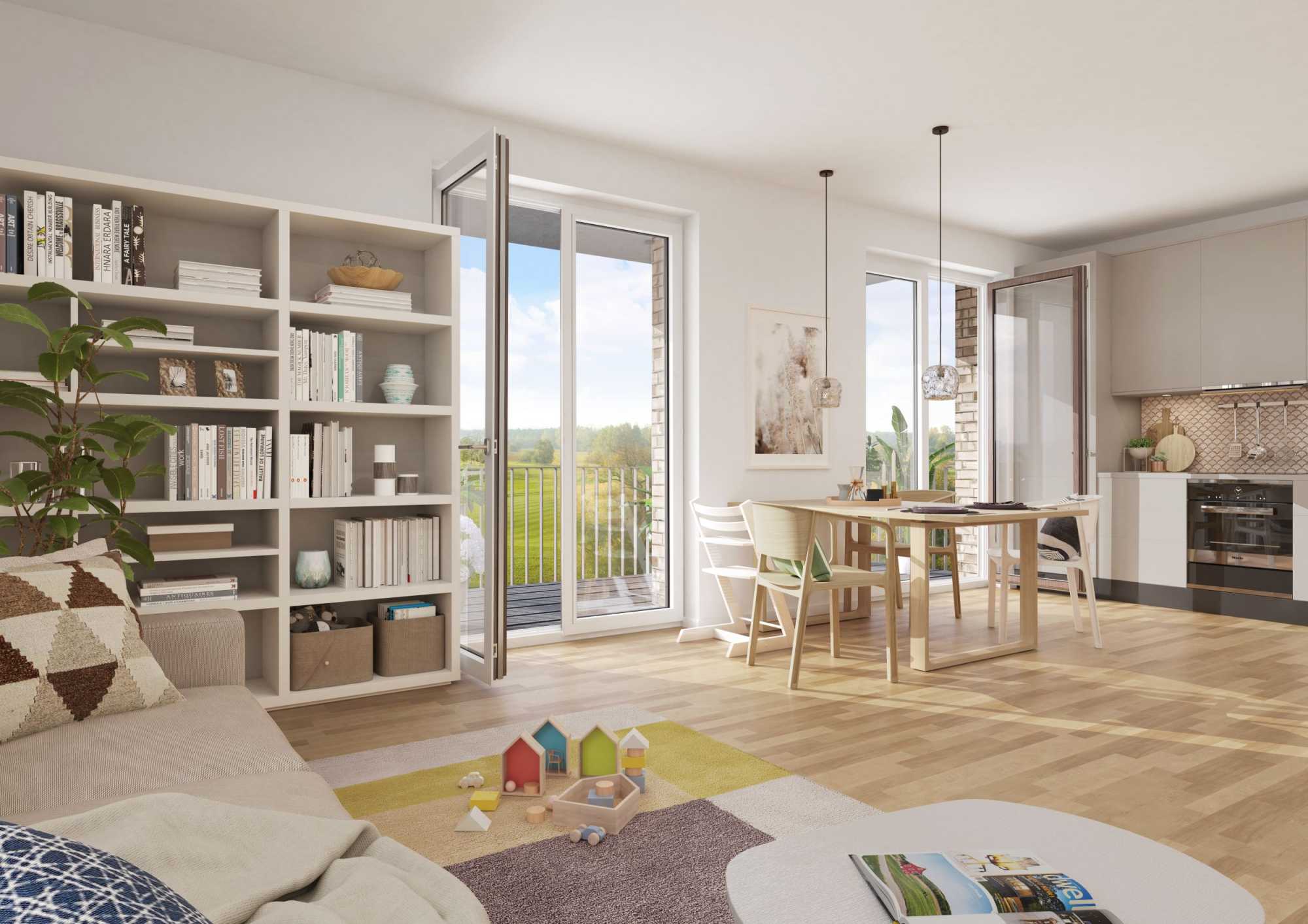 Helles Wohnzimmer mit Bücherregal, Esstisch, Küche und offenem Balkon.