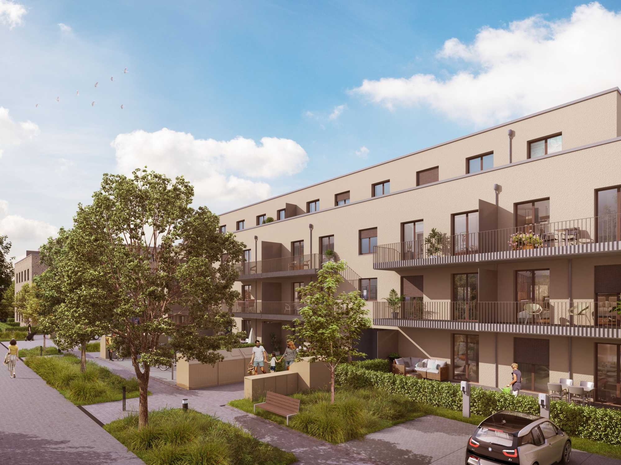 Moderne Wohnanlage mit Balkonen, Bäumen und geparktem Auto an sonnigem Tag.