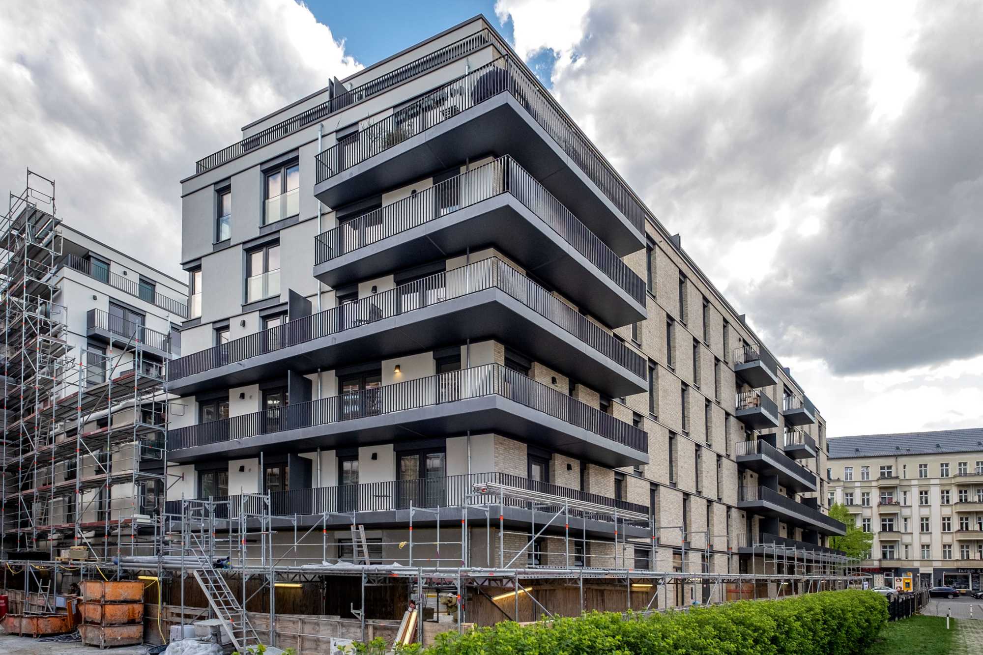 Modernes Wohngebäude mit Balkonen, teils von Gerüsten umgeben, Wolken am Himmel.