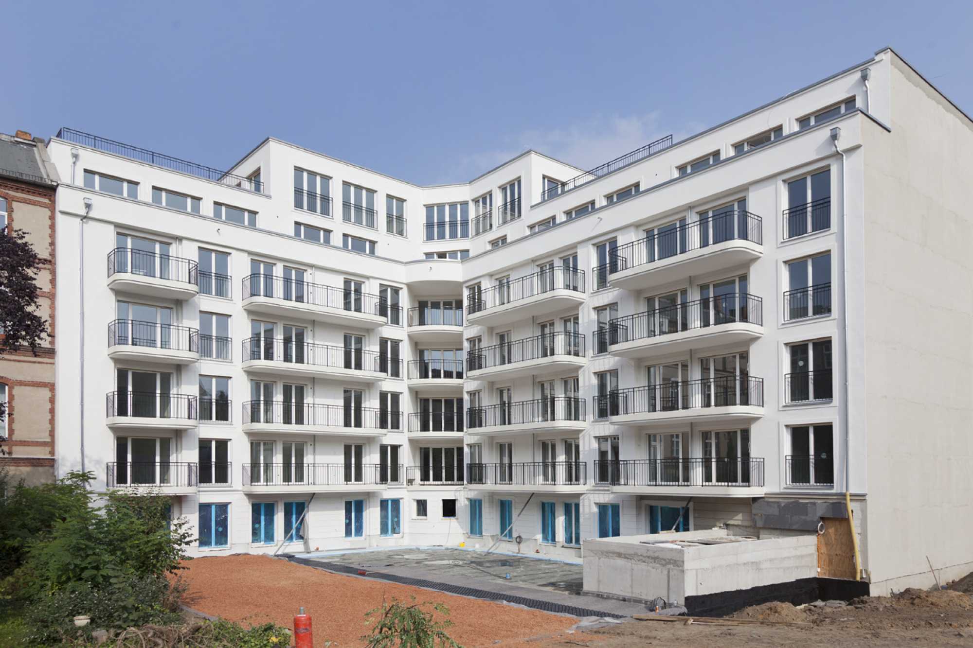 Neues, weißes Mehrfamilienhaus mit Balkonen, Baustelle im Vordergrund.