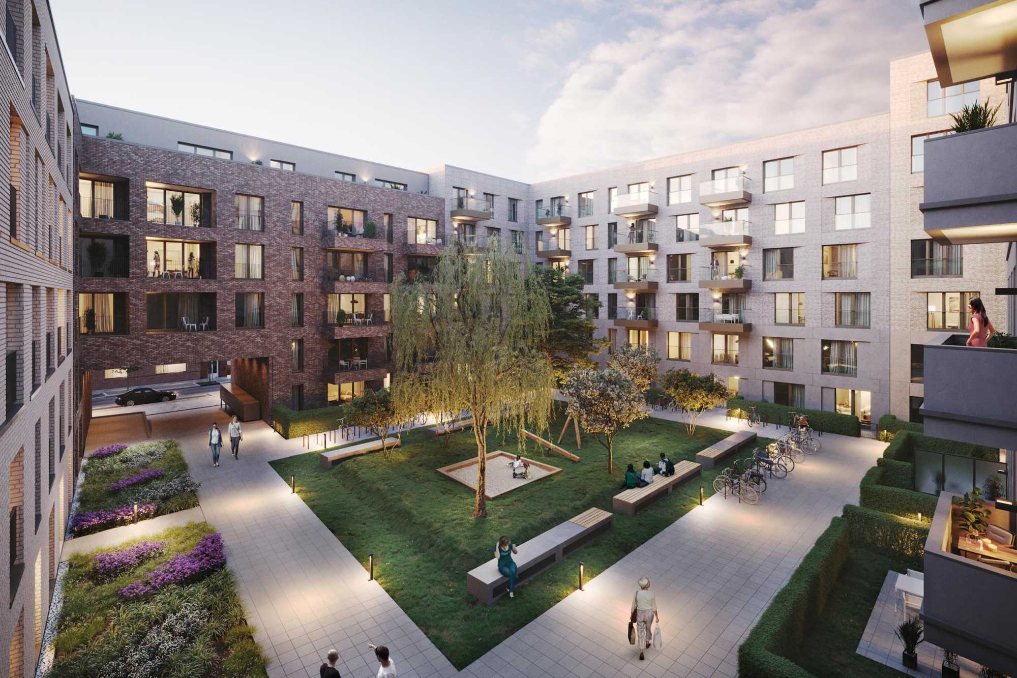 Moderner Innenhof mit Bäumen, Bänken, Gehwegen und spielenden Menschen.