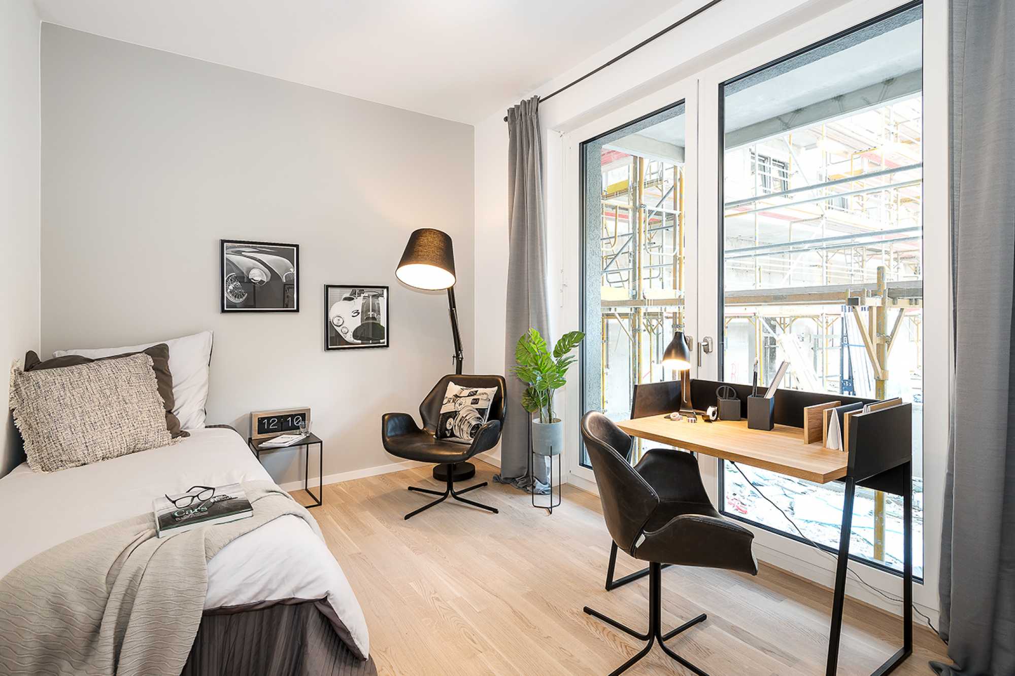 Modernes, helles Zimmer mit Bett, Schreibtisch, Sessel und großer Fensterfront.